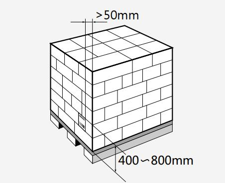 高度高于1m的物流單元:托盤和其他高度超過(guò)1m的物流單元,標(biāo)簽應(yīng)位于距離物流單元底部或托盤表面400mm至800mm的位置,標(biāo)簽與物流單元垂直底部的邊線的距離應(yīng)不小于50mm,如下圖所示。